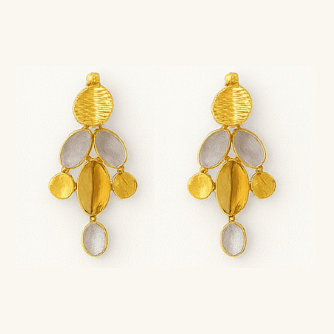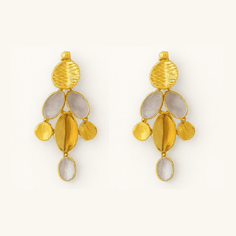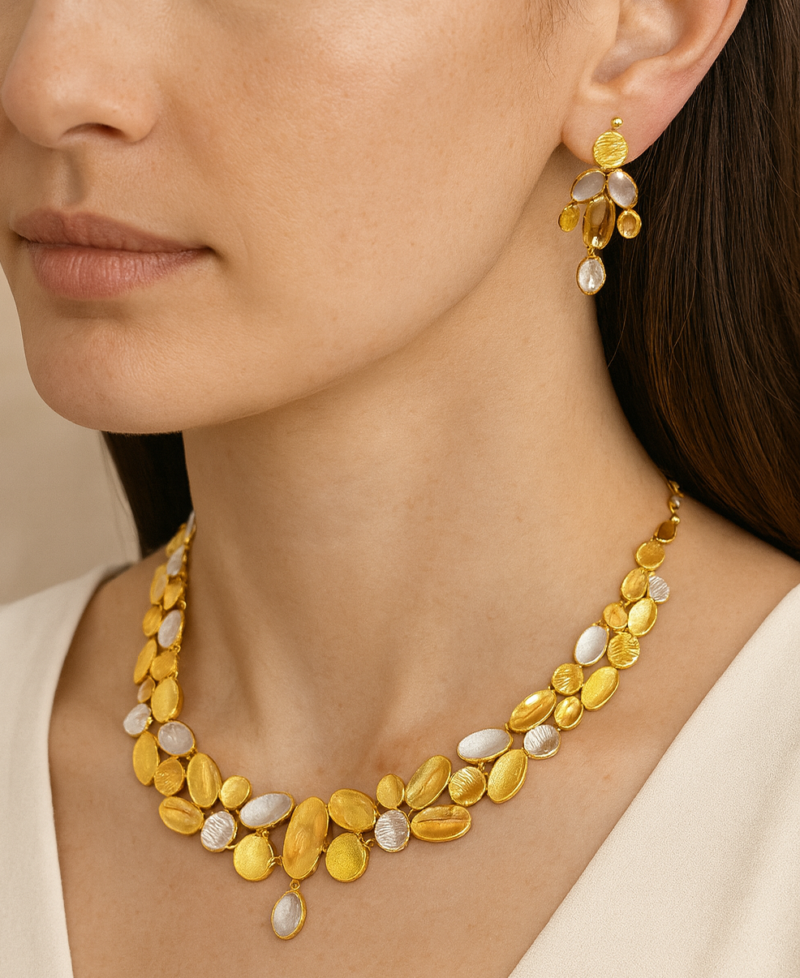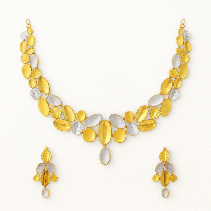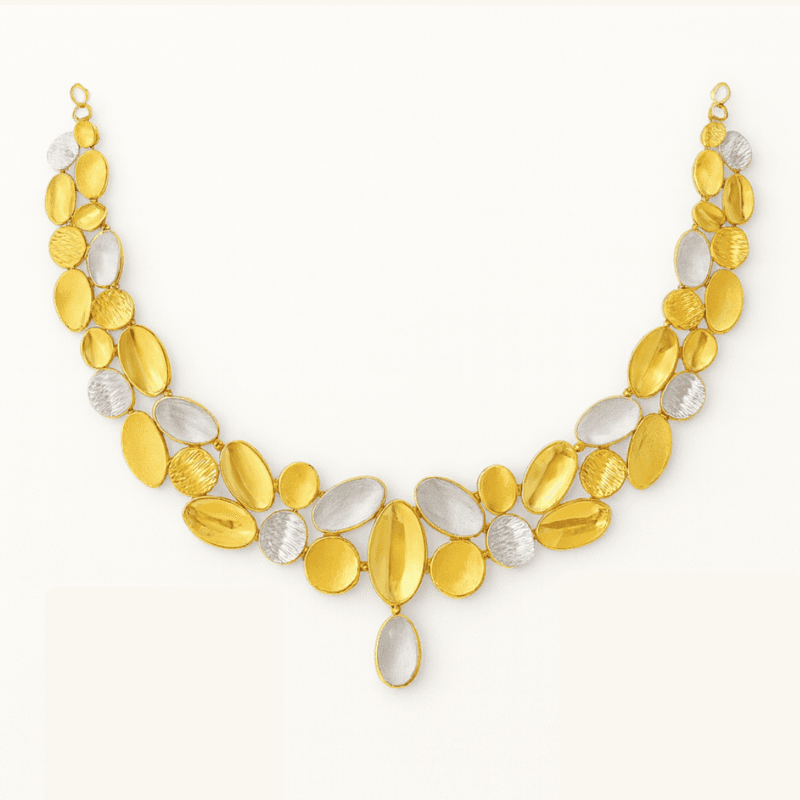 This 22kt gold necklace set is a true statement of artistry, blending timeless design with modern charm. Crafted in pure 22kt hallmarked gold, the necklace features a cascade of textured and polished oval motifs in dual tones, creating a striking play of shine and sophistication. Paired with matching drop earrings, this set is perfect for weddings, festive occasions, or as a treasured heirloom piece.